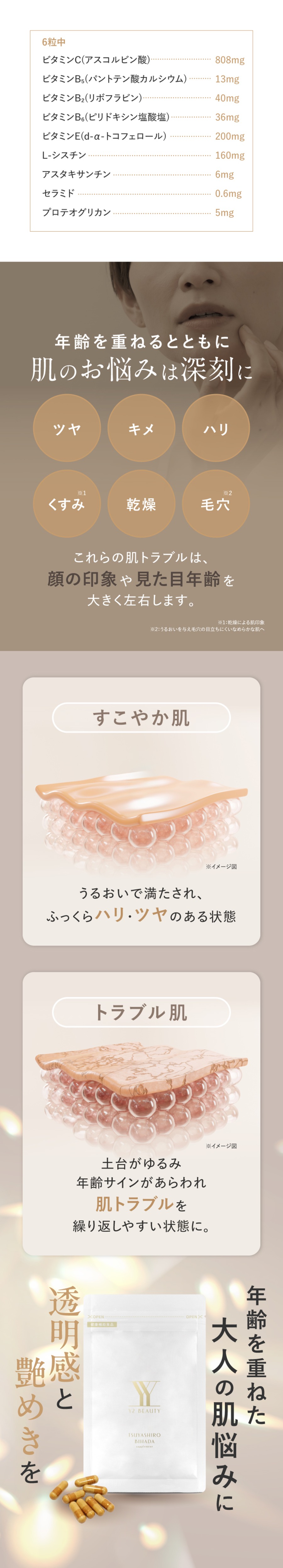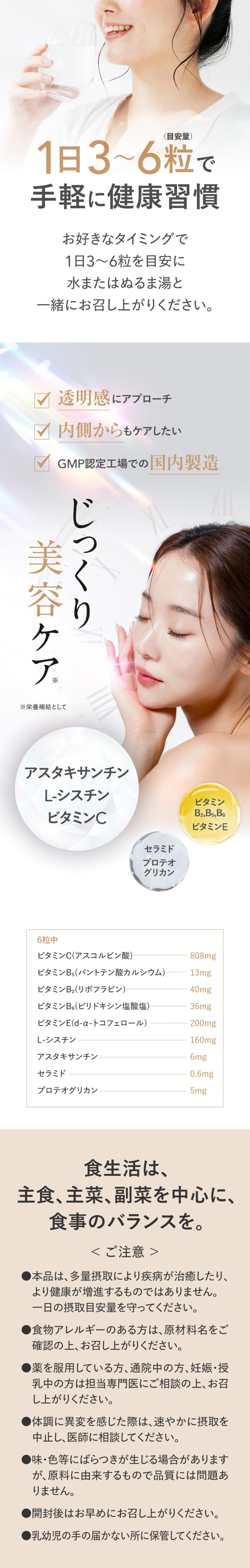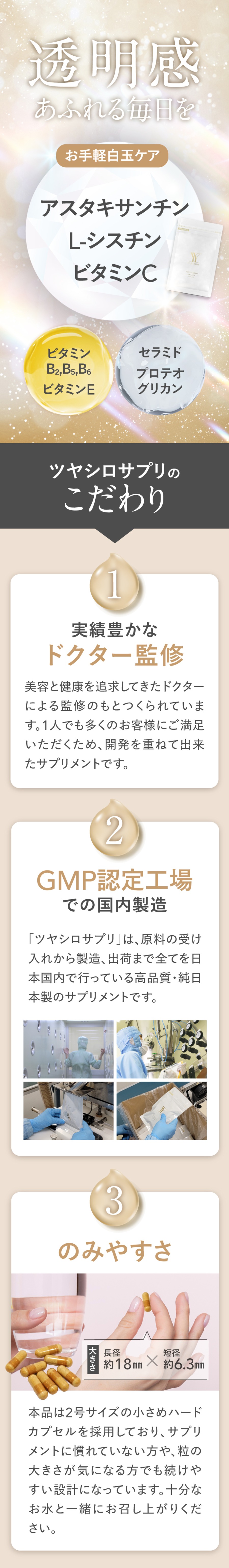 本サプリメントは、あなたの輝く肌をサポートするために開発されました。うるおいを与え、白玉のようなツヤを実現することで、毎日がもっと自信に満ちたものになります。取り入れやすい形状で、日々の生活に簡単にプラスできます。